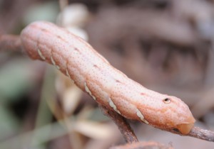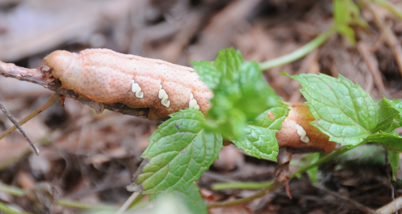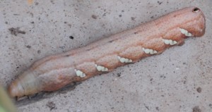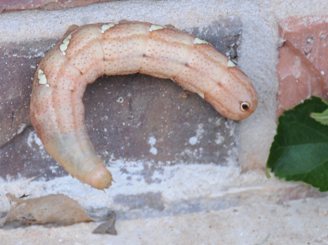 Mike’s Observations: This caterpillar first appeared dried up and dead. I noticed it after I started pulling out the vine growing on my brick facade of the house. Came back a little while later, and it was gone. I saw all the leaves had been eaten on the vine, and this caterpillar had turned from dried green to peach pink as it roamed for food. We gave it some camouflage and some leaves, but we’ll see if it can survive after I uprooted the vine it was initially dining on. The kids have been fascinated by this.